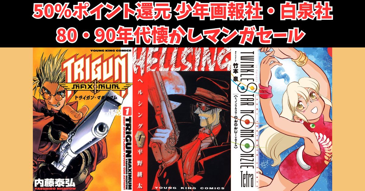 【50%ポイント還元】少年画報社・白泉社80・90年代懐かしマンガセール『HELLSING』『トライガン・マキシマム』『トゥインクルスターのんのんじー』など