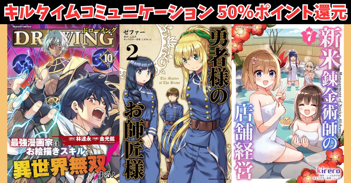【50%ポイント還元】キルタイムコミュニケーションセール『勇者様のお師匠様』『ドローイング』『新米錬金術師の店舗経営』など