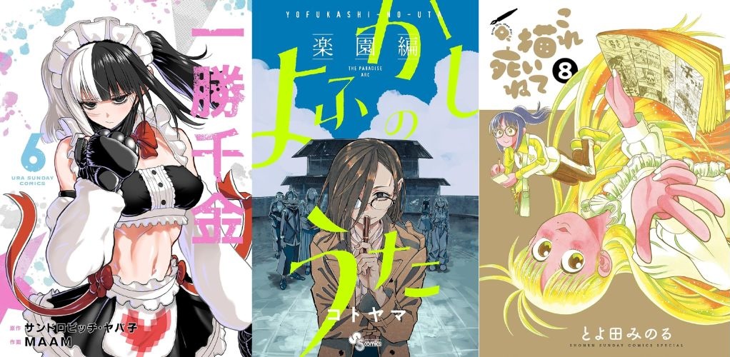 よふかしのうた -楽園編- (少年サンデーコミックス)よふかしのうた(1) (少年サンデーコミックス)よふかしのうた 公式ファンブック (少年サンデーコミックス)コトヤマ短編集 ファンフィクション (少年サンデーコミックス)だがしかし(1) (少年サンデーコミックス)一勝千金(6) (裏少年サンデーコミックス)ケンガンオメガ(30) (裏少年サンデーコミックス)ケンガンアシュラ(1) (裏少年サンデーコミックス)ダンベル何キロ持てる?(20) (裏少年サンデーコミックス)ブルーウルスス(1) (裏少年サンデーコミックス)これ描いて死ね(8) (ゲッサン少年サンデーコミックス)大ダーク(9) (ゲッサン少年サンデーコミックス)ドロヘドロ(1) (IKKI COMIX)COSMOS(7) (サンデーGXコミックス)葬送のフリーレン(14) (少年サンデーコミックス)終の退魔師 ―エンダーガイスター―<無修正ver.>(21) (サイコミ×裏少年サンデーコミックス)名探偵コナン(107) (少年サンデーコミックス)異世界美少女受肉おじさんと(16) (サイコミ×裏少年サンデーコミックス)廻天のアルバス(6) (少年サンデーコミックス)BLUE GIANT MOMENTUM(5) (ビッグコミックススペシャル)シルバーマウンテン(1) (少年サンデーコミックス)からくりサーカス(1) (少年サンデーコミックス)うしおととら(1) (少年サンデーコミックス)アオイホノオ(32) (ゲッサン少年サンデーコミックス)ありす、宇宙までも(4) (ビッグコミックス)百瀬アキラの初恋破綻中。(4) (少年サンデーコミックス)新九郎、奔る!(21) (ビッグコミックス)アオアシ(40) (ビッグコミックス)空母いぶきGREAT GAME(17) (ビッグコミックス)尾守つみきと奇日常。(7) (少年サンデーコミックス)MIX(23) (ゲッサン少年サンデーコミックス)劇光仮面(7) (ビッグコミックススペシャル)正直不動産(22) (ビッグコミックス)路傍のフジイ(5) (ビッグコミックス)マネマネにちにち(2) (ゲッサン少年サンデーコミックス)ミハルの戦場(2) (マンガワンコミックス)機動戦士ガンダム サンダーボルト(26) (ビッグコミックススペシャル)『機動戦士ガンダムサンダーボルト』26集限定版 描きおろしBOOK付き (ビッグコミックススペシャル)機動戦士ガンダム アグレッサー(22) (少年サンデーコミックススペシャル)ヨシダ檸檬ドロップス(4) (ビッグコミックス)帝乃三姉妹は案外、チョロい。(16) (少年サンデーコミックス)レッドブルー(15) (少年サンデーコミックス)となりの席のヤツがそういう目で見てくる(4) (サンデーうぇぶりコミックス)龍と苺(22) (少年サンデーコミックス)トニカクカワイイ(32) (少年サンデーコミックス)あと6日で滅びる崖っぷち国家のハーレムに召喚されてしまった(2) (やわらかスピリッツ)ロードマギアの弟子(4) (サンデーうぇぶりコミックス)ソアラと魔物の家(6) (サンデーうぇぶりコミックス)ひらやすみ(9) (ビッグコミックス)日陰者でもやり直していいですか?(2) (サイコミ×裏少年サンデーコミックス)昭和天皇物語(17) (ビッグコミックス)負けヒロインが多すぎる!@comic(5) (マンガワンコミックス)永世乙女の戦い方(13) (ビッグコミックス)レ・セルバン(7) (マンガワンコミックス)上杉くんは女の子をやめたい(3) (ちゃおコミックス)九条の大罪(14) (ビッグコミックス)闇金ウシジマくん(1) (ビッグコミックス)少年院ウシジマくん(5) (マンガワンコミックス)闇金ウシジマくん外伝 肉蝮伝説(24) (やわらかスピリッツ)ブラック・ラグーン(13) (サンデーGXコミックス)BLACK LAGOON エダ イニシャルステージ(7) (サンデーGXコミックス)レジスタ!(1) (ゲッサン少年サンデーコミックス)ホタルの嫁入り(9) (マンガワン女子部)写らナイんです(5) (少年サンデーコミックス)ゾン100~ゾンビになるまでにしたい100のこと~(20) (サンデーGXコミックス)獣王と薬草(6) (裏少年サンデーコミックス)TSUYOSHI 誰も勝てない、アイツには(27) (サイコミ×裏少年サンデーコミックス)異世界ありがとう(8) (マンガワンコミックス)マチネとソワレ(17) (ゲッサン少年サンデーコミックス)パラショッパーズ(2) (少年サンデーコミックス)魔王城でおやすみ(30) (少年サンデーコミックス)アイツノカノジョ(7) (サンデーうぇぶりコミックス)うしろの正面カムイさん(11) (裏少年サンデーコミックス)あくたの死に際(4) (裏少年サンデーコミックス)東京最低最悪最高!(2) (ビッグコミックス)血と灰の女王(25) (マンガワンコミックス)最強女師匠たちが育成方針を巡って修羅場(10) (マンガワンコミックス)ふしぎ遊戯 白虎仙記(5) (フラワーコミックス)黒薔薇アリスD.C.al fine(5) (フラワーコミックスα)スーパースターを唄って。(6) (ビッグコミックス)東京貧困女子。(15) (ビッグコミックス)深夜食堂(30) (ビッグコミックススペシャル)ジャジャ(38) (サンデーGXコミックス)はじめてのセフレ(1) (やわらかスピリッツ)チラチラ(5) (ビッグコミックス)ダウナーお姉さんは遊びたい(2) (てんとう虫コミックススペシャル)おじ転生~悪役令嬢の加齢なる生活~(3) (サンデーうぇぶりコミックス)サイコアイズ(4) (サンデーうぇぶりコミックス)今日も吹部は!(3) (サンデーうぇぶりコミックス)JUMBO MAX~ハイパーED薬